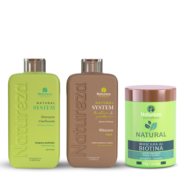 Kit Natureza Cosméticos - Natural System - Shampoo Purificante, Anti Frizz e Máscara de Biotina 1L